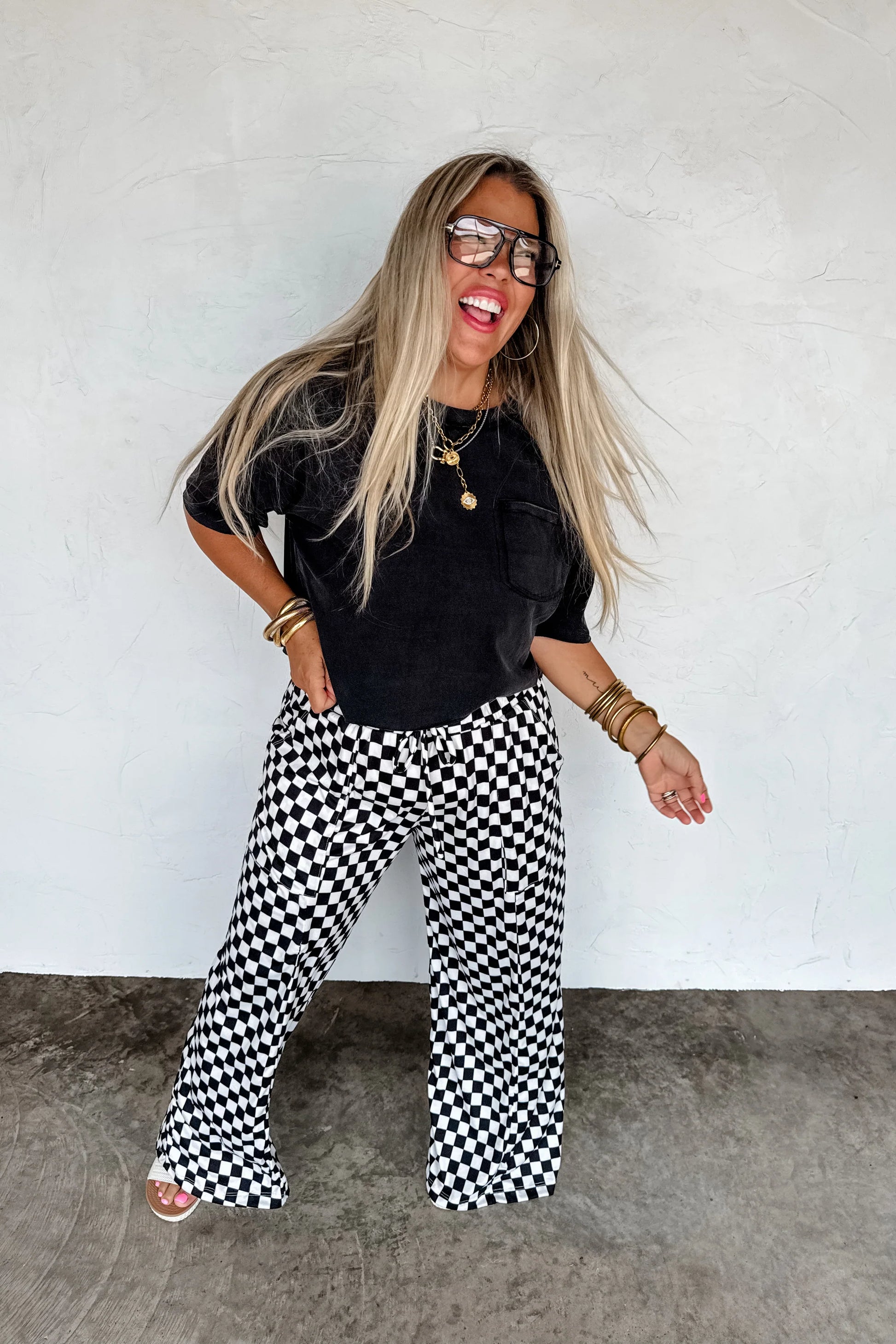 Cloud soft and so so stretchy! These checker pants are the perfect way to add a "pop" to any outfit!! Features panel pockets, wide legs and elastic waist with faux drawstring. Made in the USA.