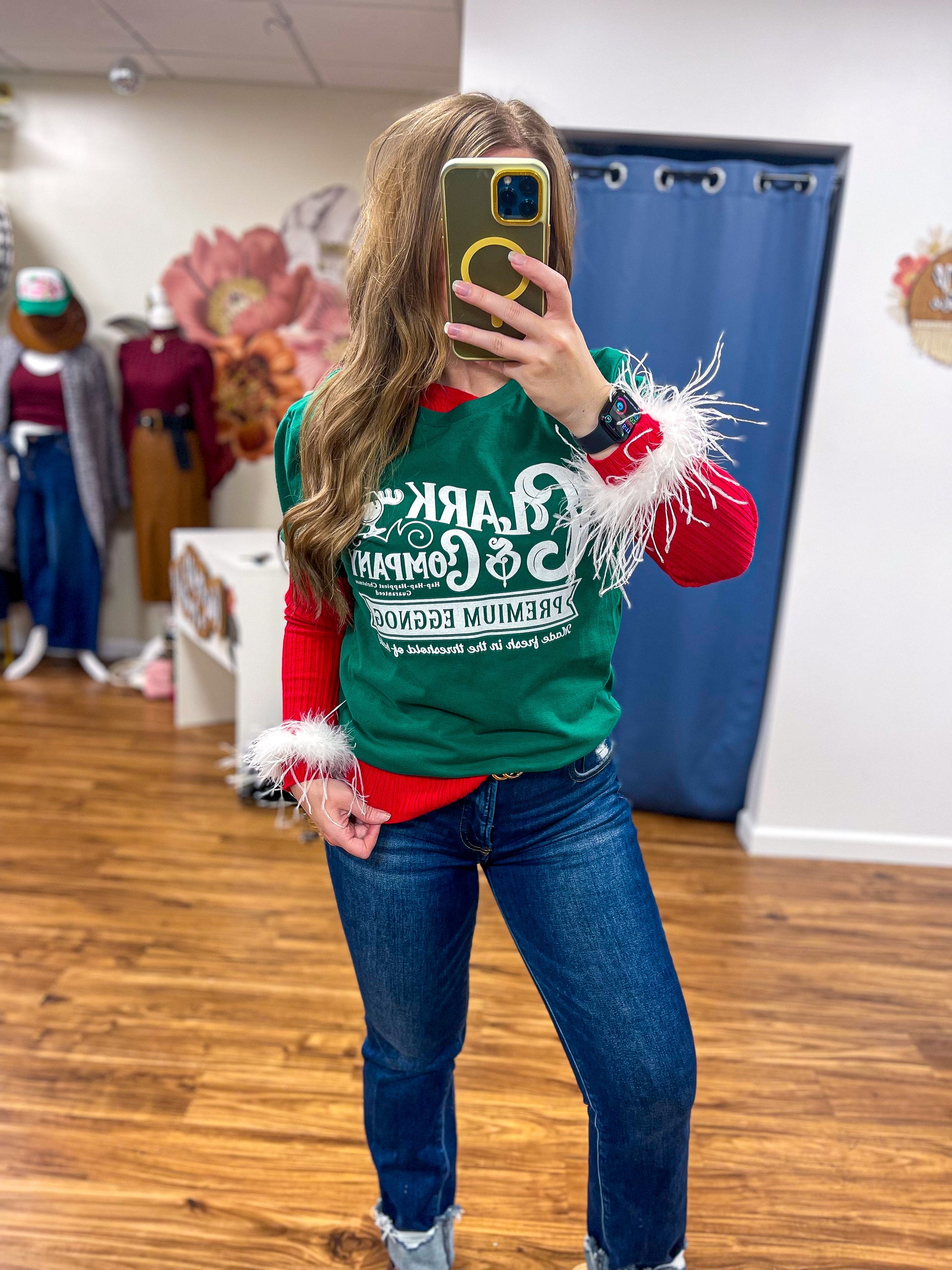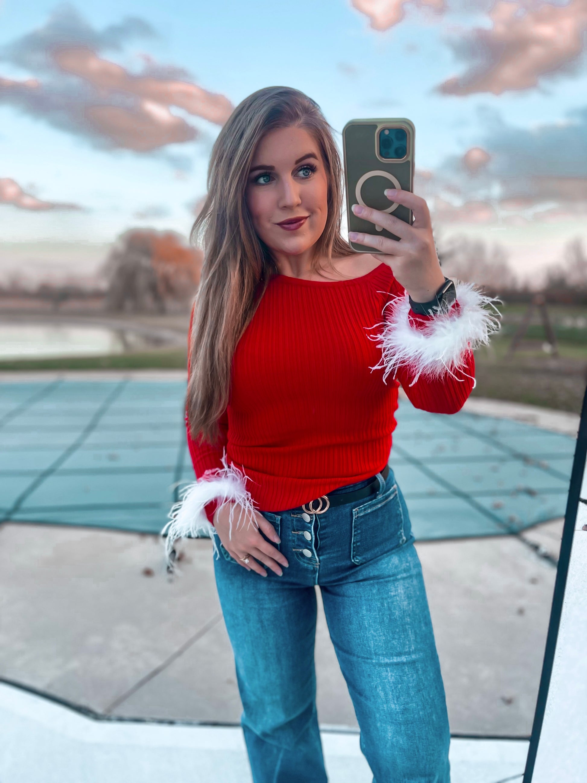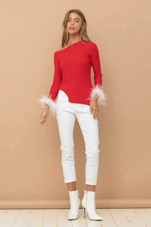 Get ready to be the talk of the town in our Feather Cuff Sweater! This off-shoulder top features an asymmetrical feather cuff and ribbed design for a uniquely chic look. Perfect for any occasion this holiday season, this sweater will have you feeling cozy and stylish.