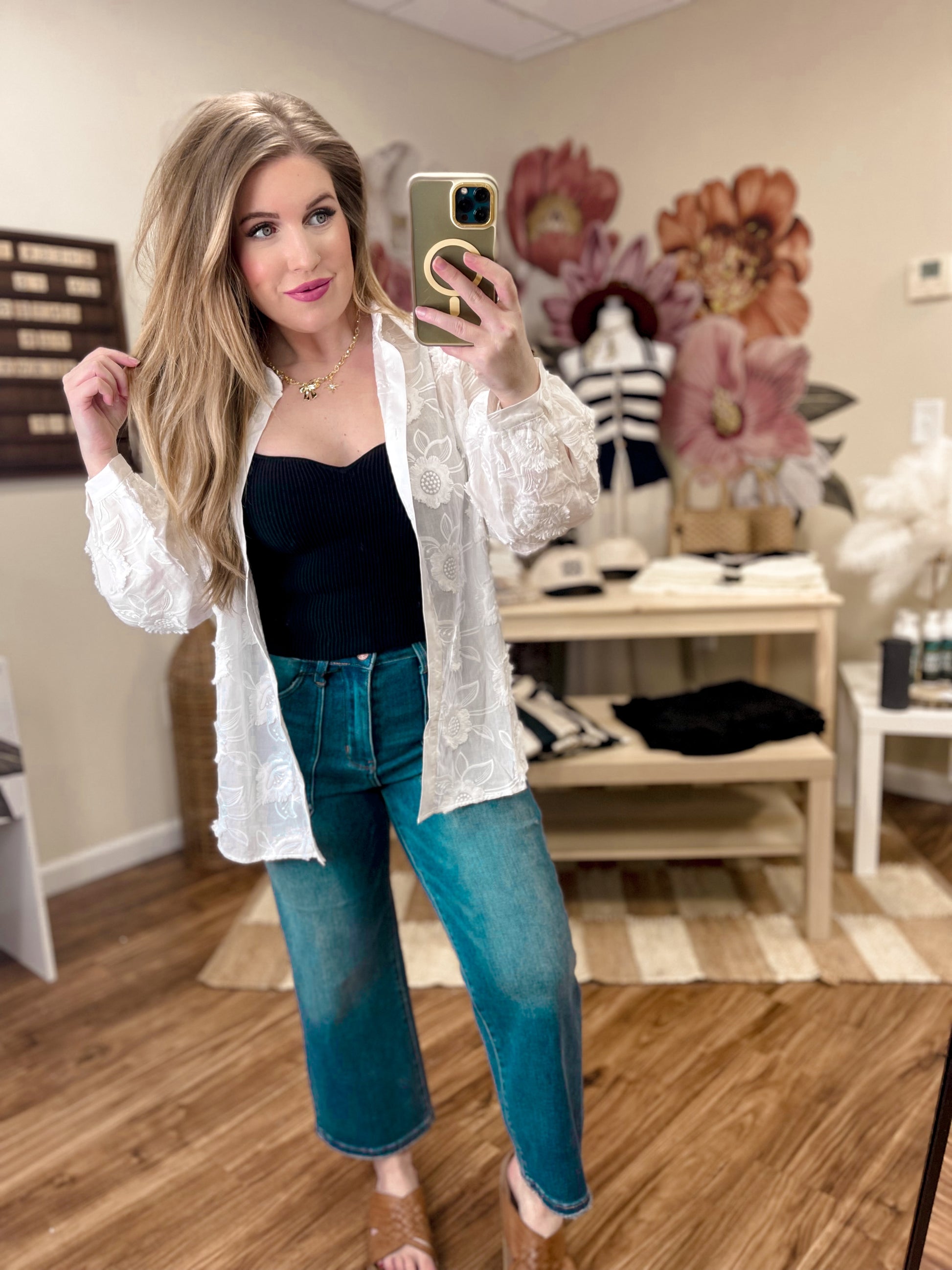 FLOWER APPLIQUE OVERSIZED BUTTON DOWN SHIRT - FLOWER APPLIQUE WOVEN FABRIC - BUTTON DOWN - LONG SLEEVE