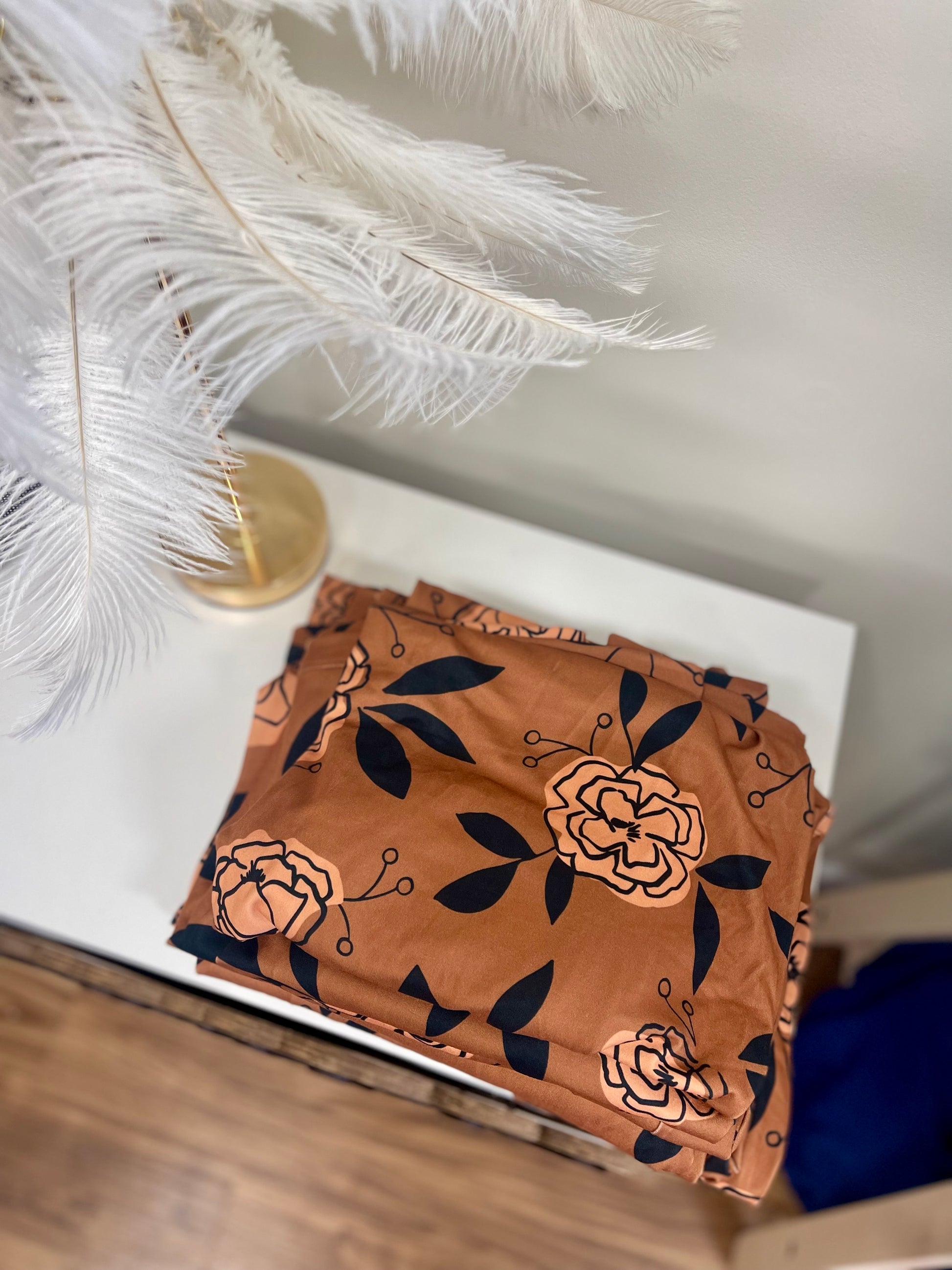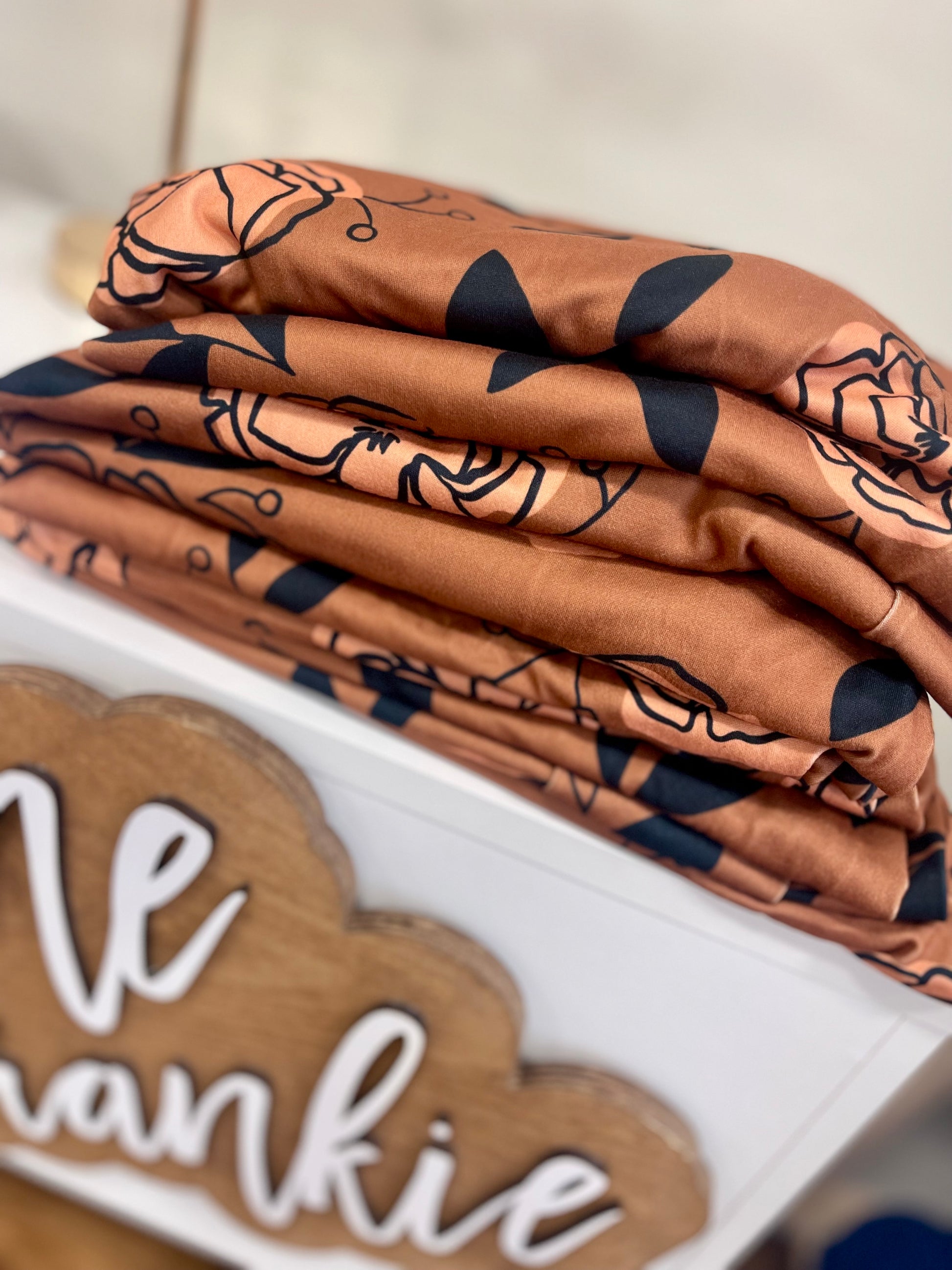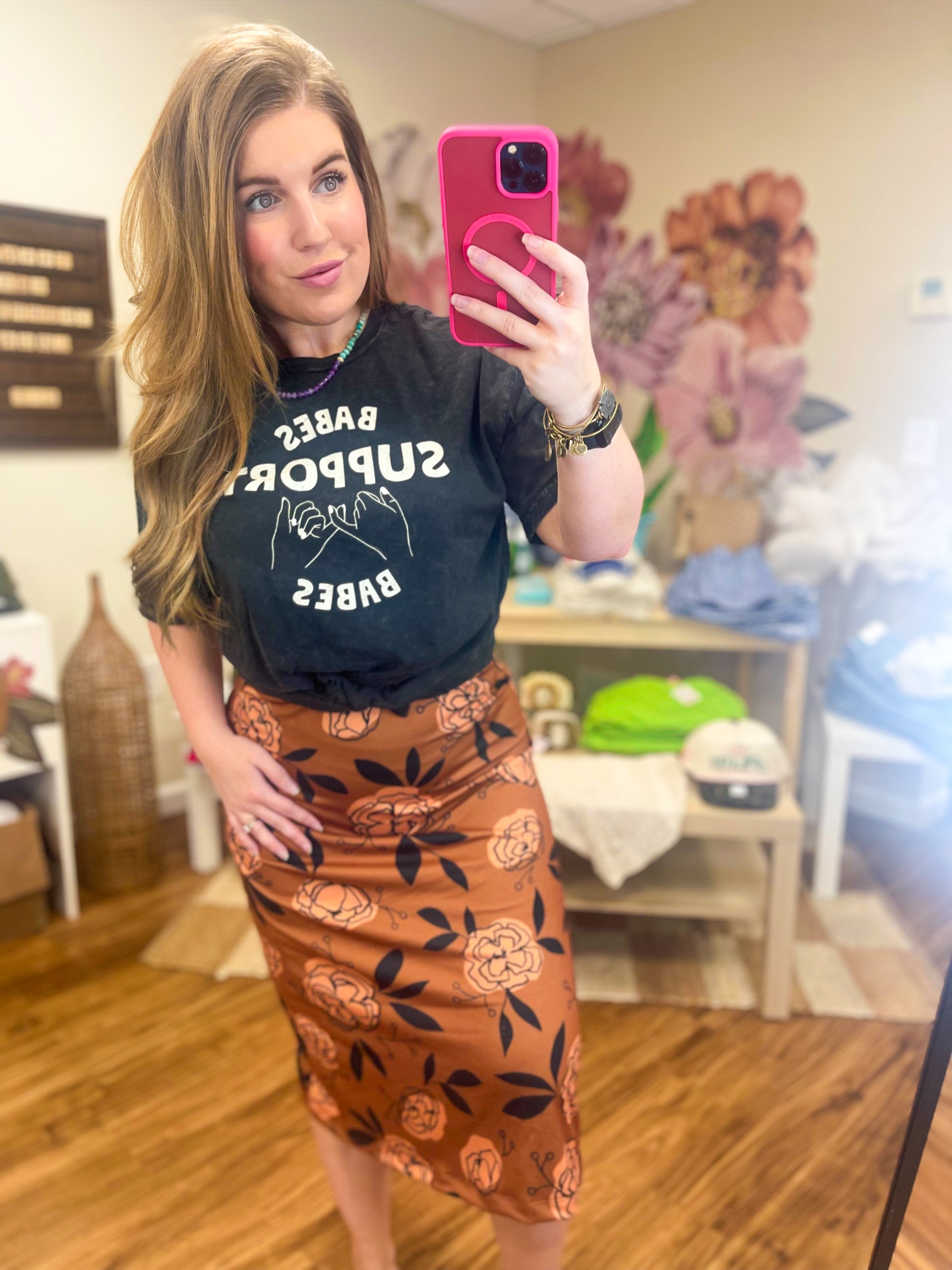 Cozy up in Autumn Ember, a hand-crafted midi skirt that brings the magic of fall to life. Made from our signature buttery soft fabric, this piece features a rich rust base adorned with a delicate black floral print—perfectly moody, perfectly autumn.