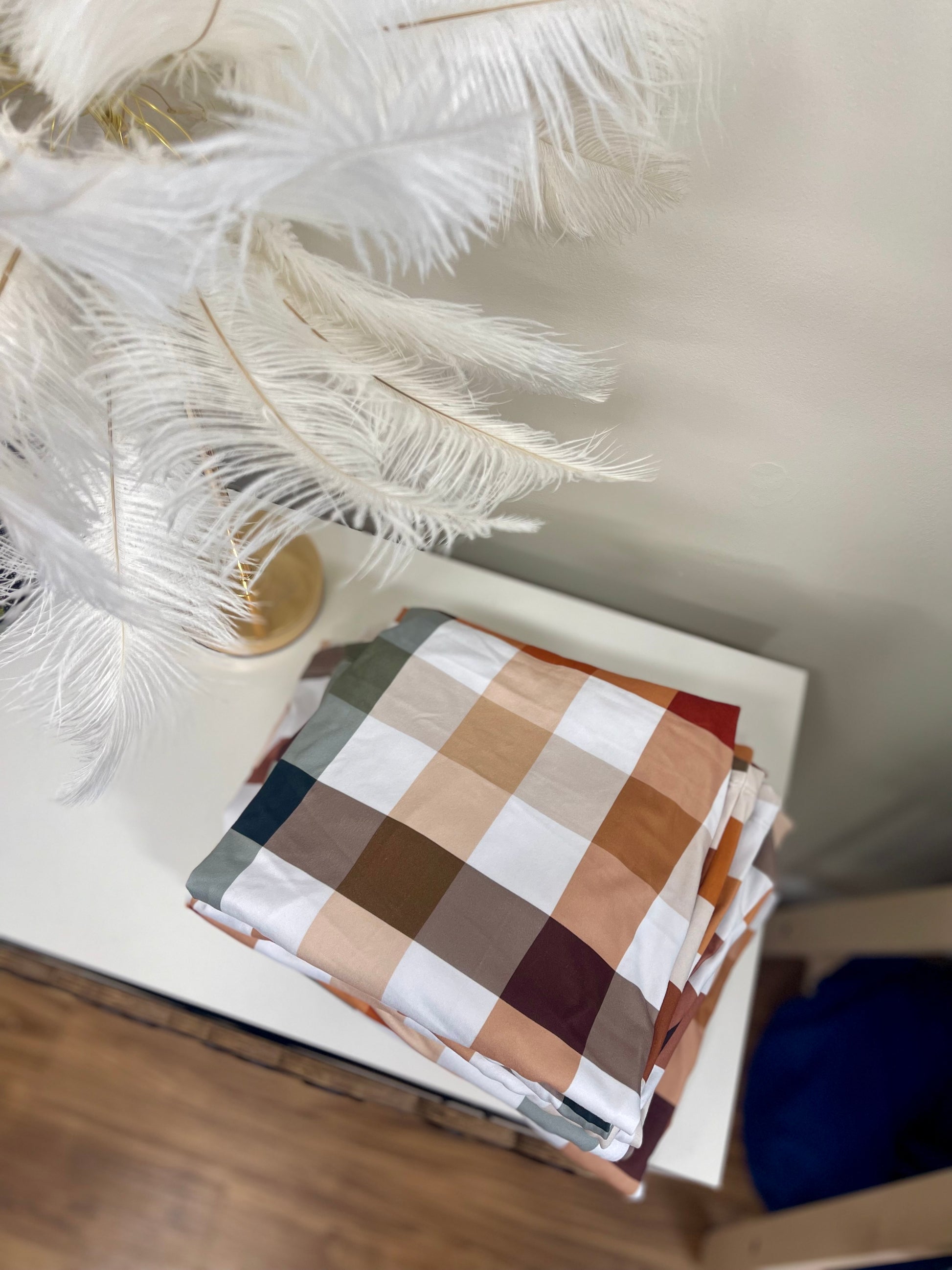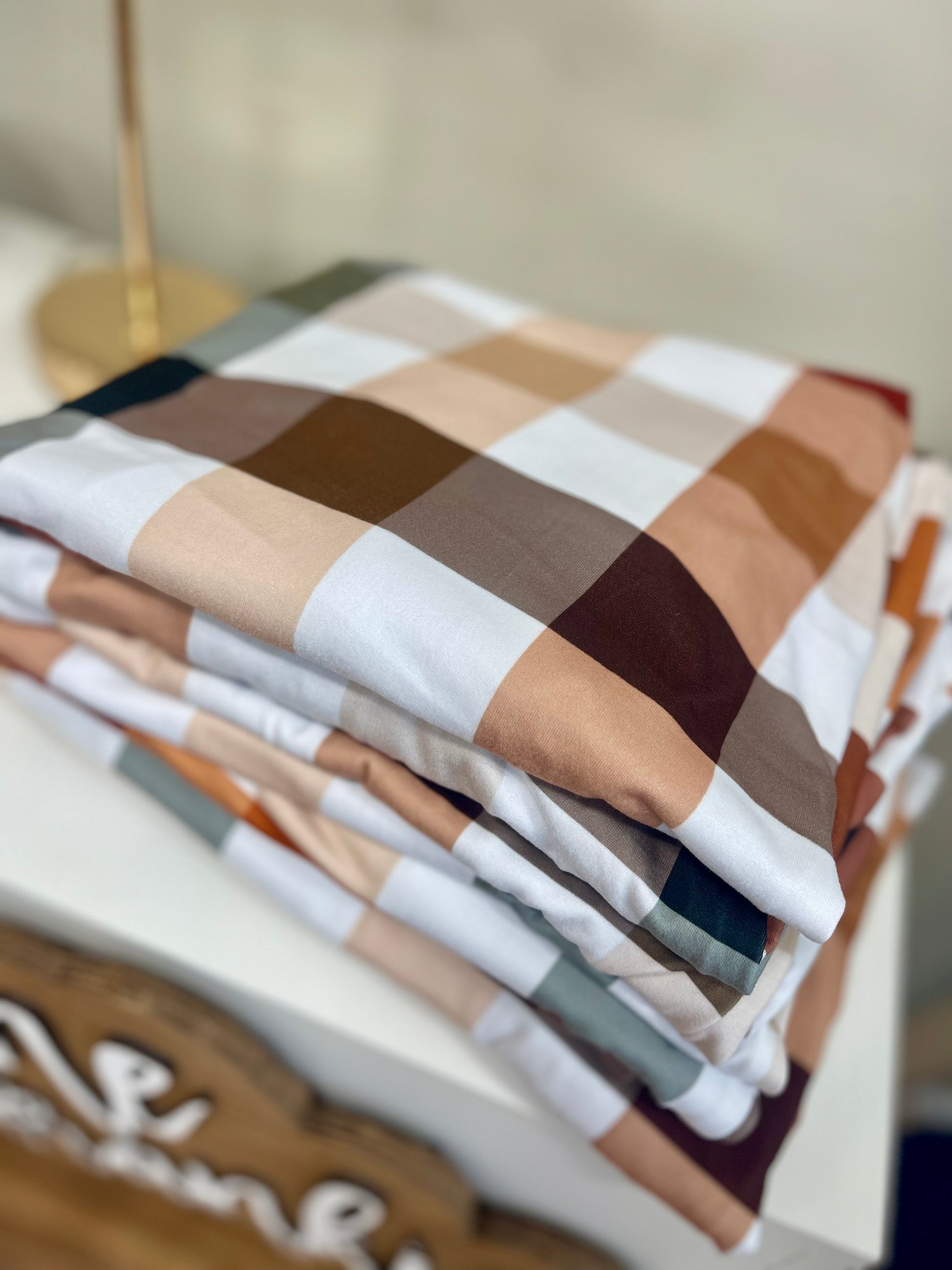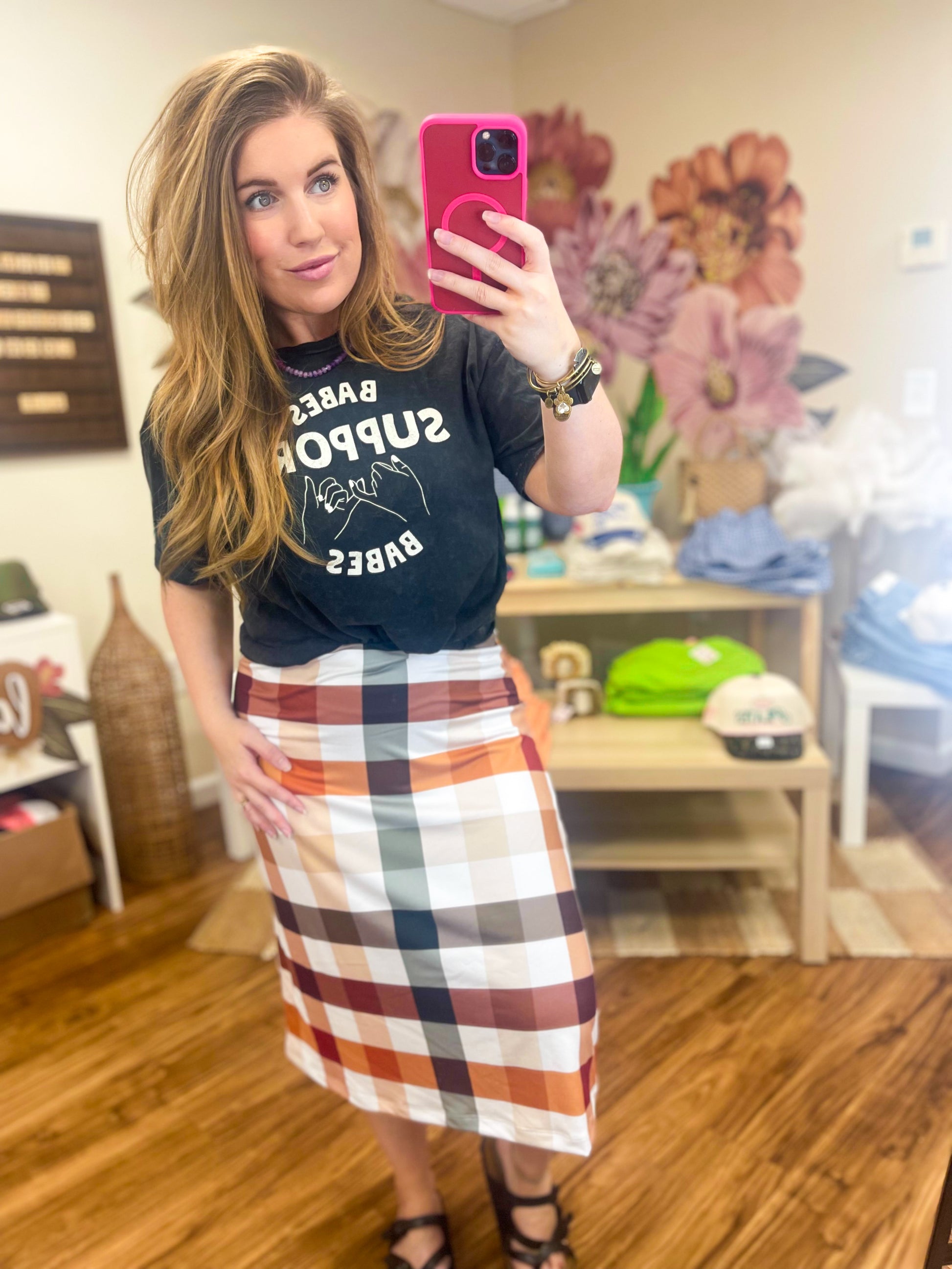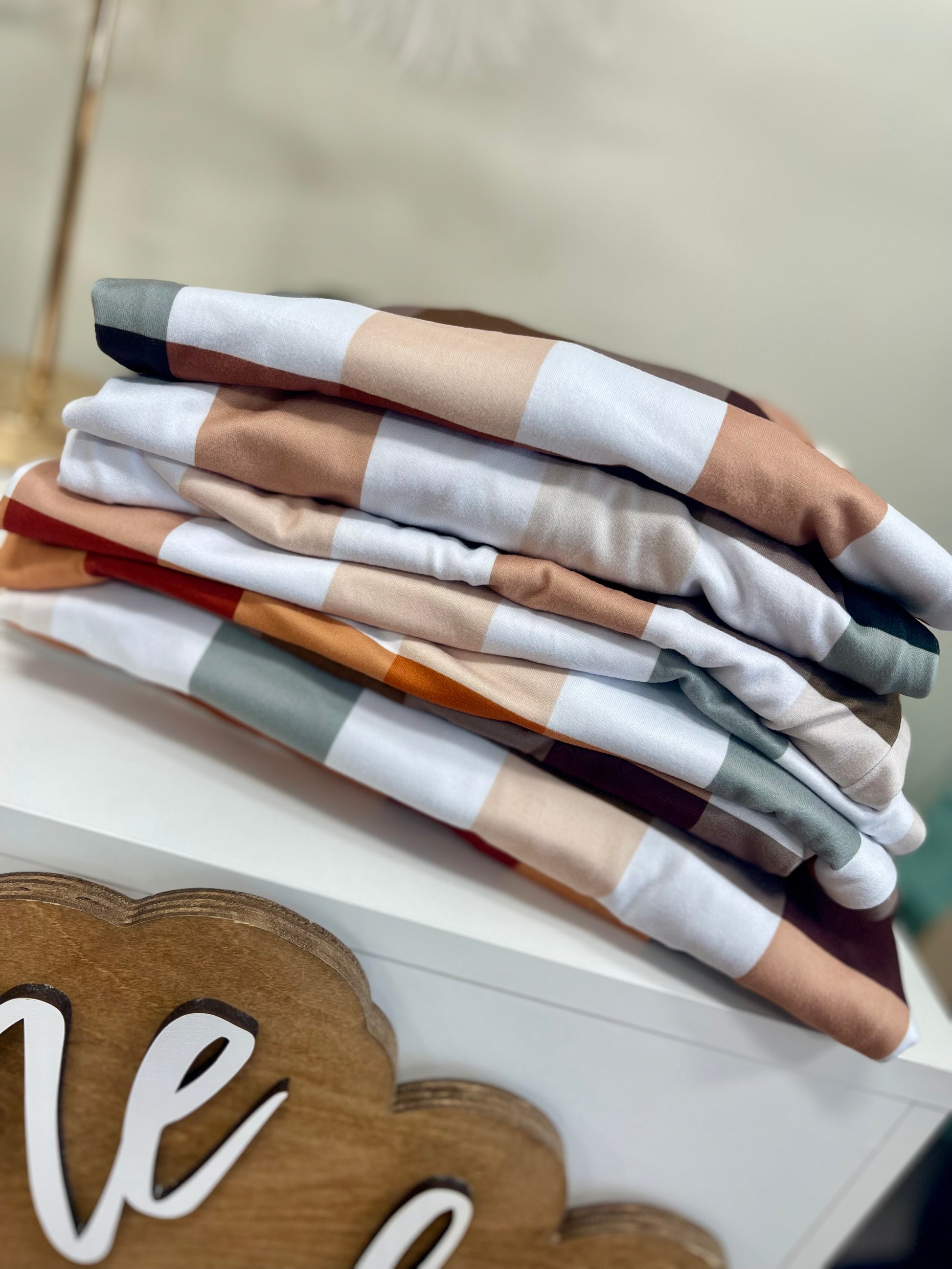Bold yet cozy, Chai Lines is a one-of-a-kind midi skirt that captures the essence of fall in every thread. Handcrafted with our signature buttery soft fabric, this piece features a grid pattern in warm autumn tones—think cinnamon, golden chai, and maple—bringing all the seasonal vibes in a perfectly tailored silhouette.