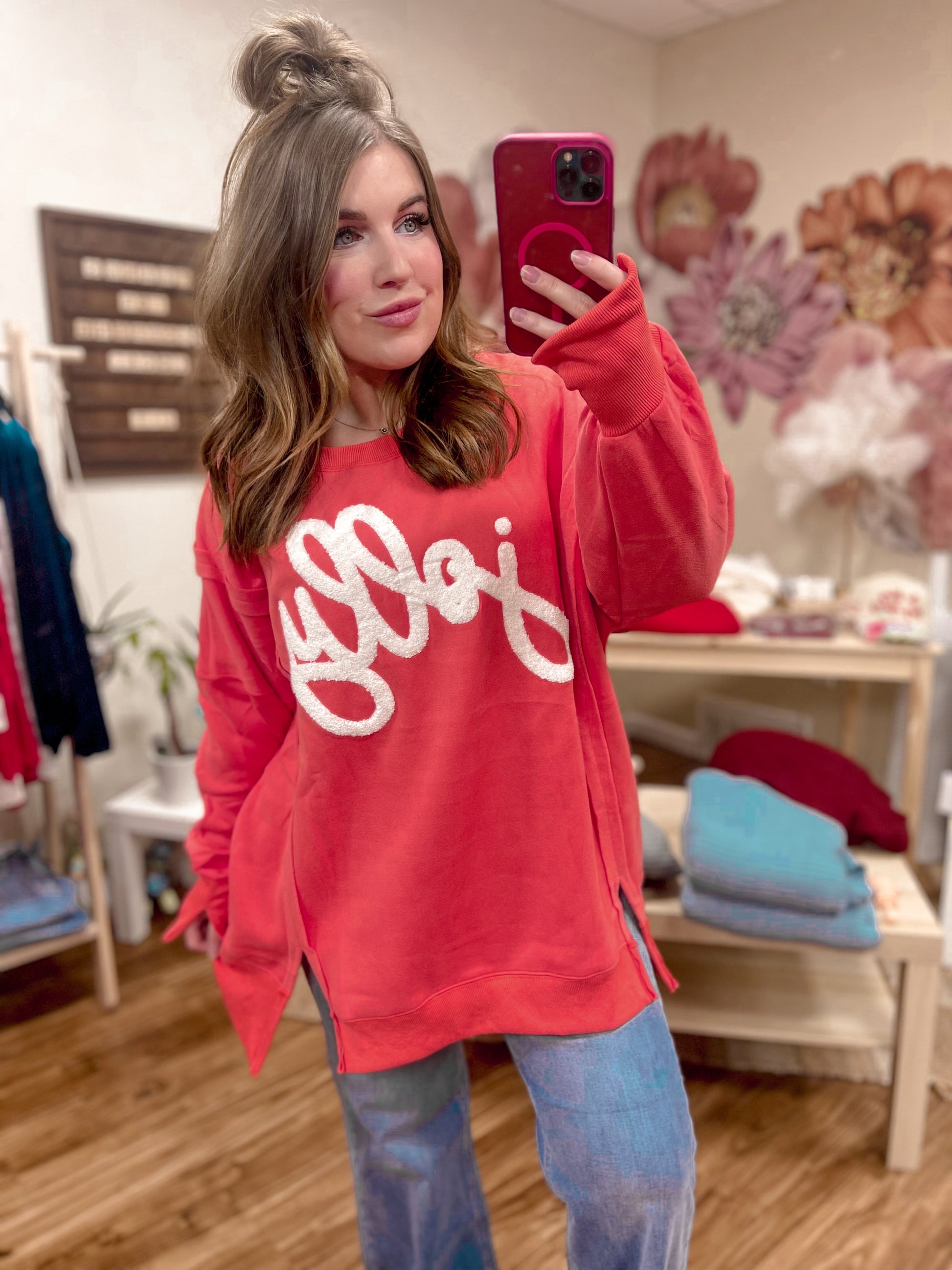 Add a touch of cheer to your holiday wardrobe with these cozy and stylish pullovers! The cream "JOY" sweatshirt features bold red block lettering for a classic, clean holiday look, while the vibrant red "jolly" pullover showcases playful script embroidery for a fun and festive vibe. Made from soft, mid-weight fabric with a relaxed fit—perfect for layering or lounging. ETA Last week of Oct/First week of Nov.