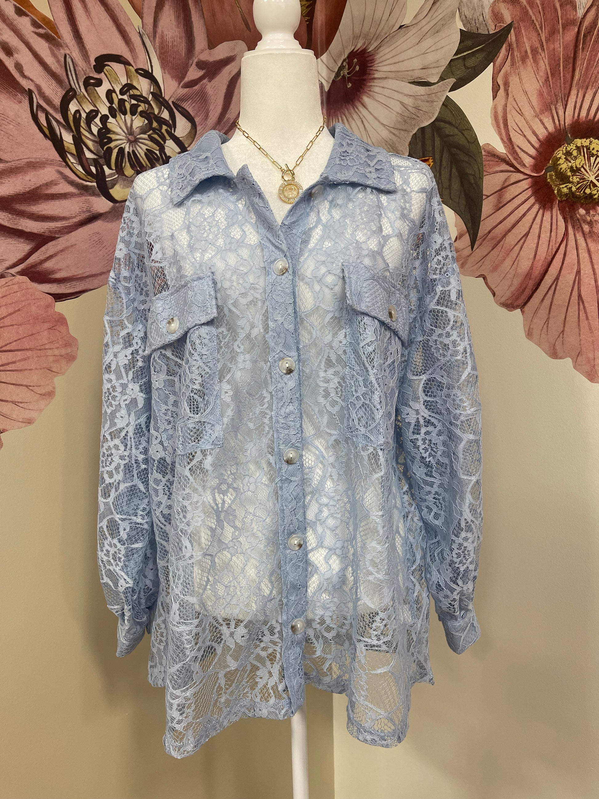 Stay cool (and hot) in this light blue sheer lace shacket. Perfect for a layered look or as a beach cover-up. You'll be sure to love the breezy, versatile style and chic vibe. Add some lace to your wardrobe!