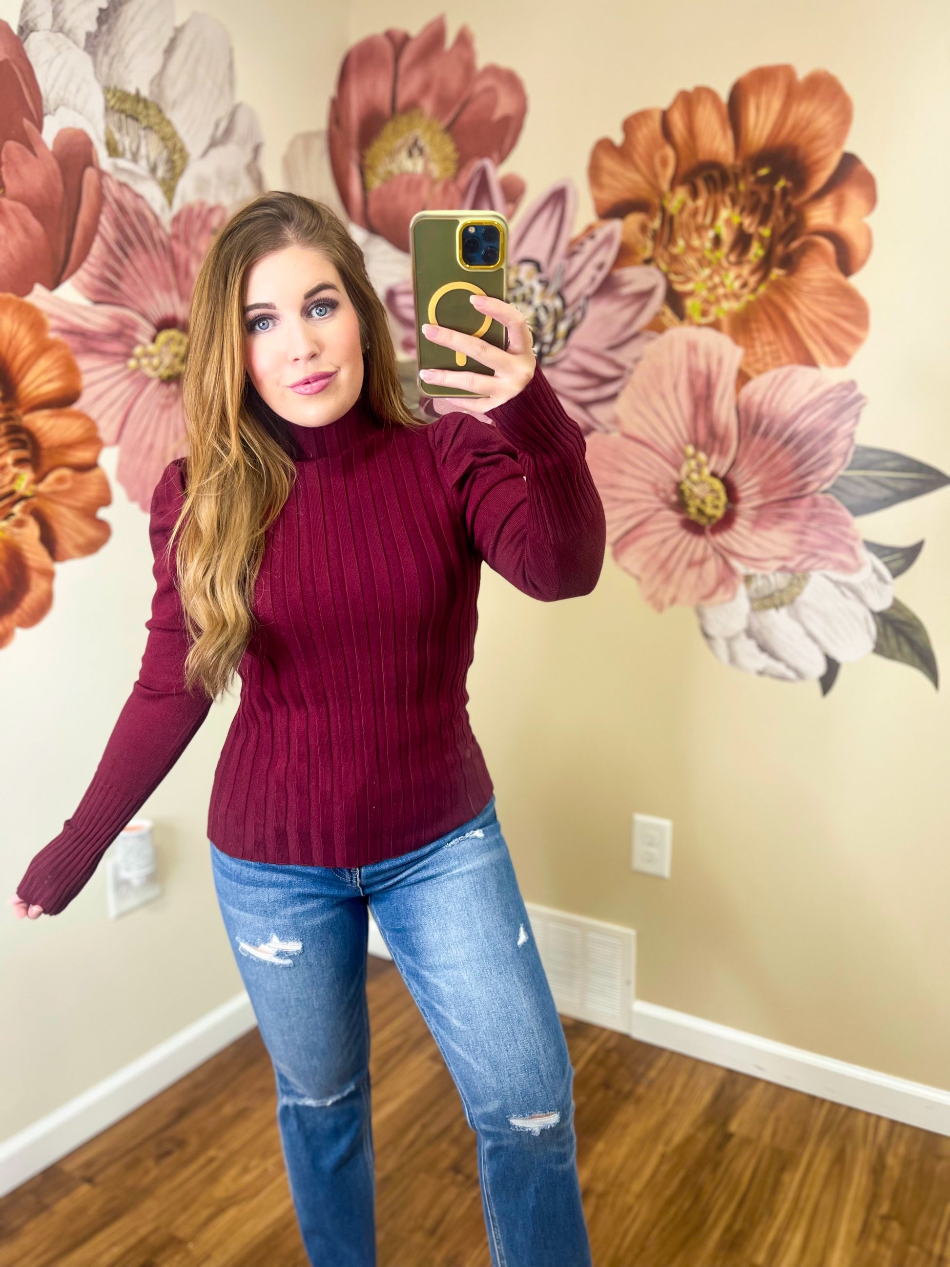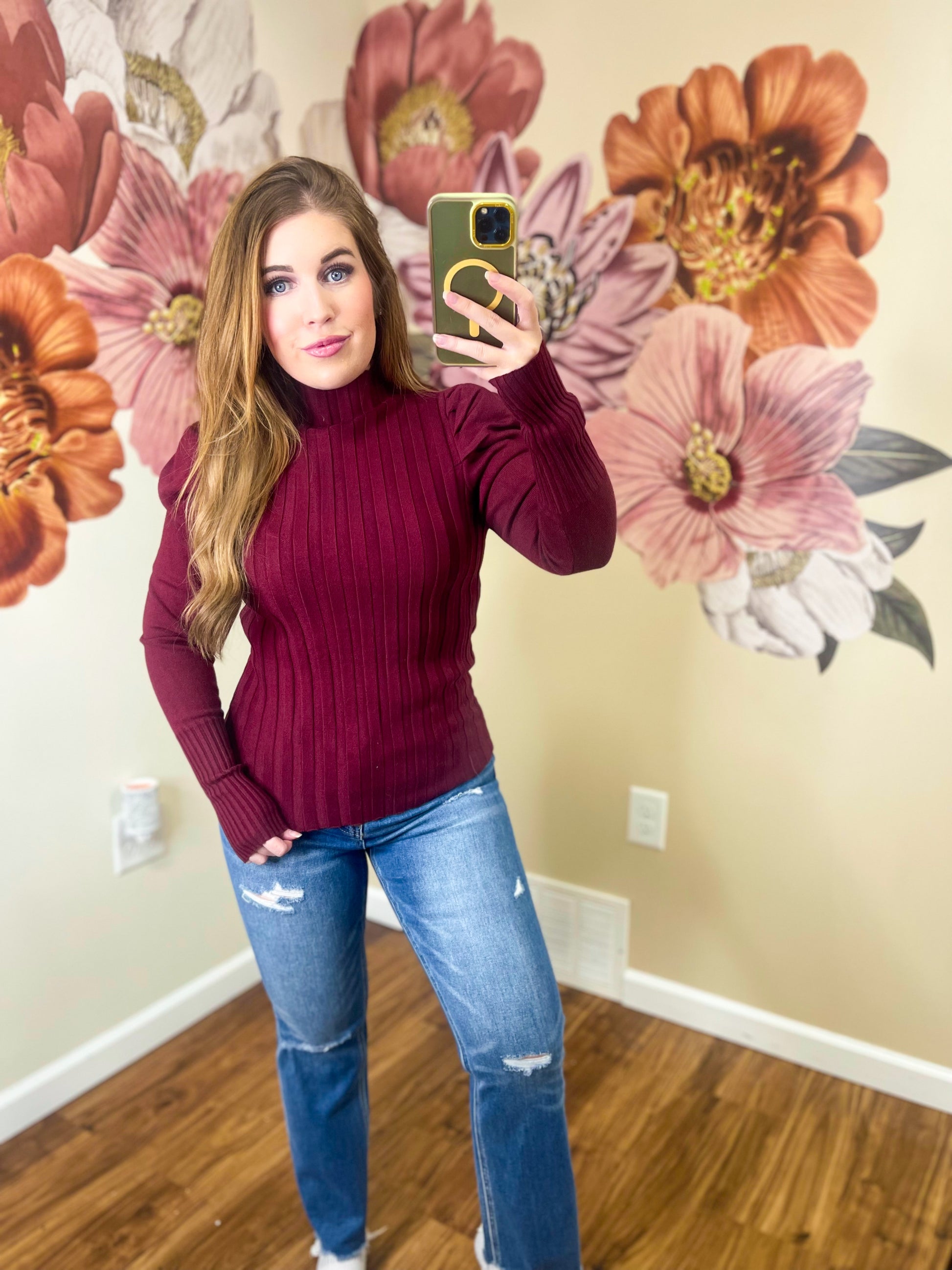 Introducing the Maroon Puff Sleeve Sweater, a must-have for feminine flair. With a mock neck and puff sleeves, this soft knit fitted bodice sweater is both stylish and comfortable. Elevate your wardrobe with this trendy piece.