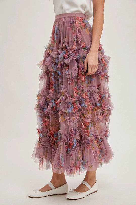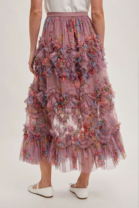 The Mauve Ruffled Midi Skirt is a charming and feminine piece that exudes elegance and grace. Crafted with a lightweight mesh overlay adorned with delicate floral patterns, this midi skirt features tiered ruffles that add texture and movement. The soft inner lining ensures comfort and modesty while maintaining a flowing silhouette. Its elastic or zippered waistband provides a secure and flattering fit. Perfect for spring and summer occasions, this skirt pairs beautifully with a fitted blouse or a cropped knit top. Dress it up with heels for an event or down with sandals for a casual daytime look. Valentine's day look.