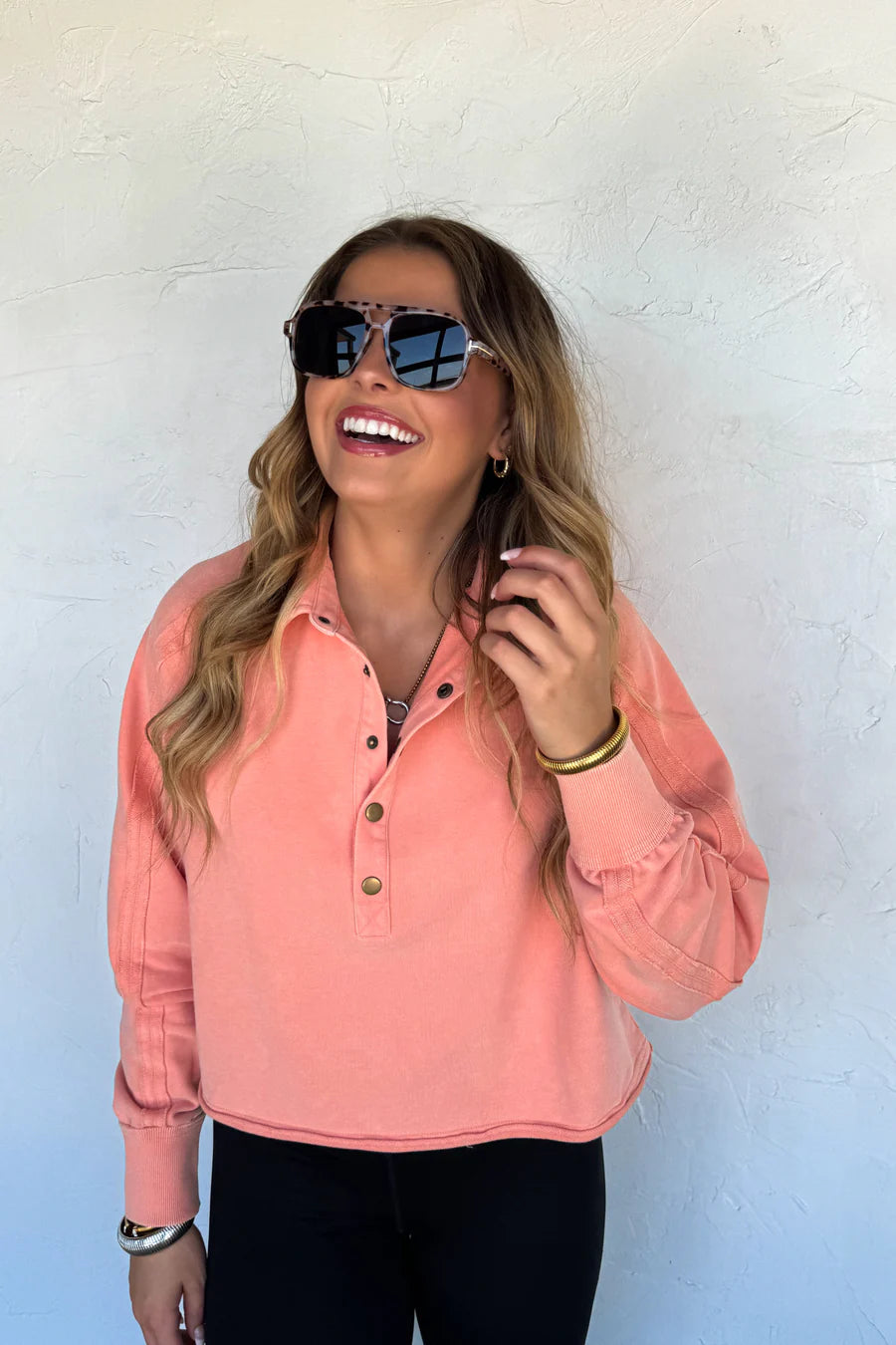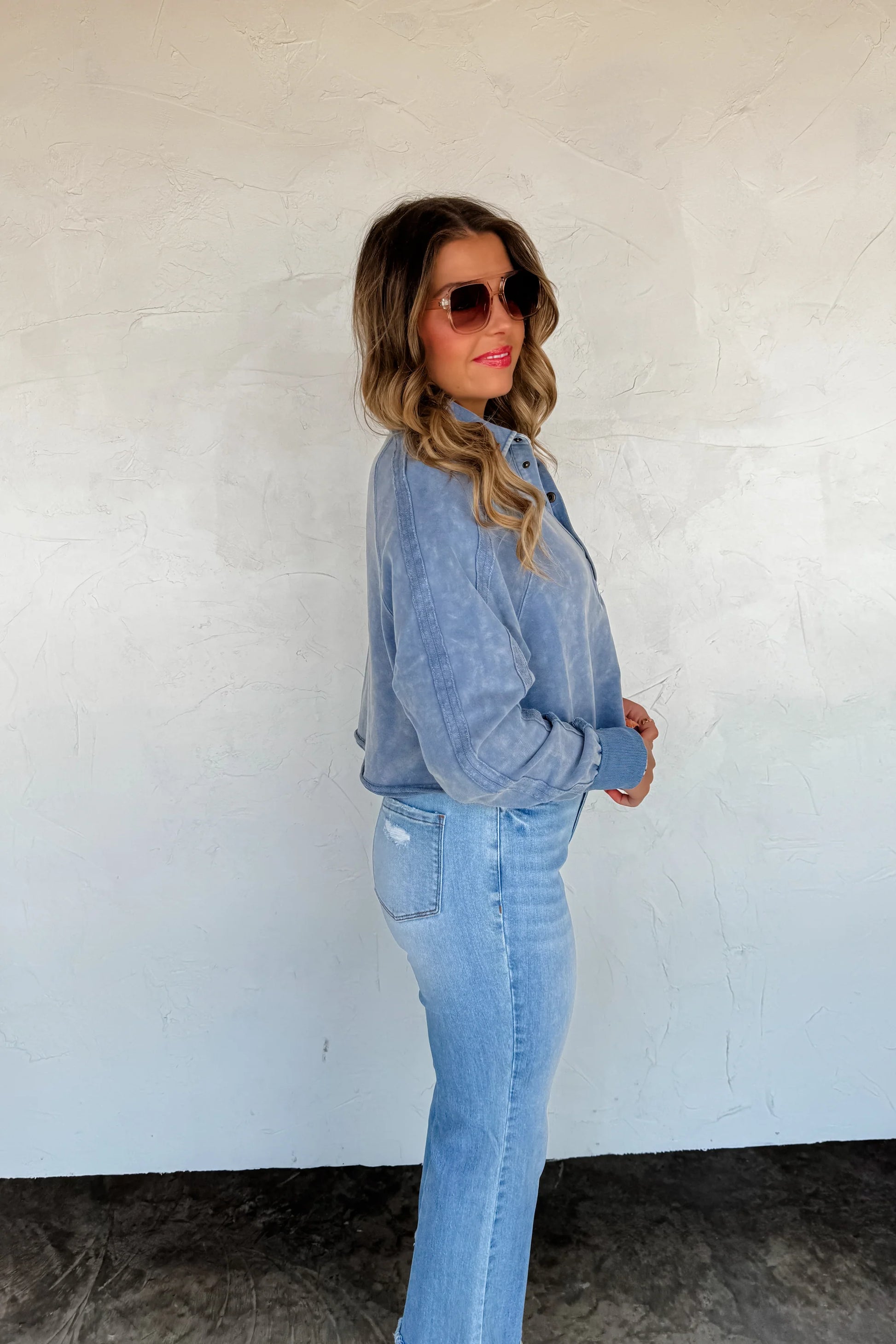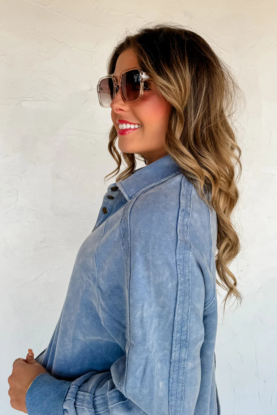 We spared no attention to detail in this raw hem/semi crop pullover! Such a relaxed, trendy look! Has a slouchy fit, vintage wash, exposed seaming and ribbed cuffs. Has super soft terry "sweatshirt" feel on the inside!