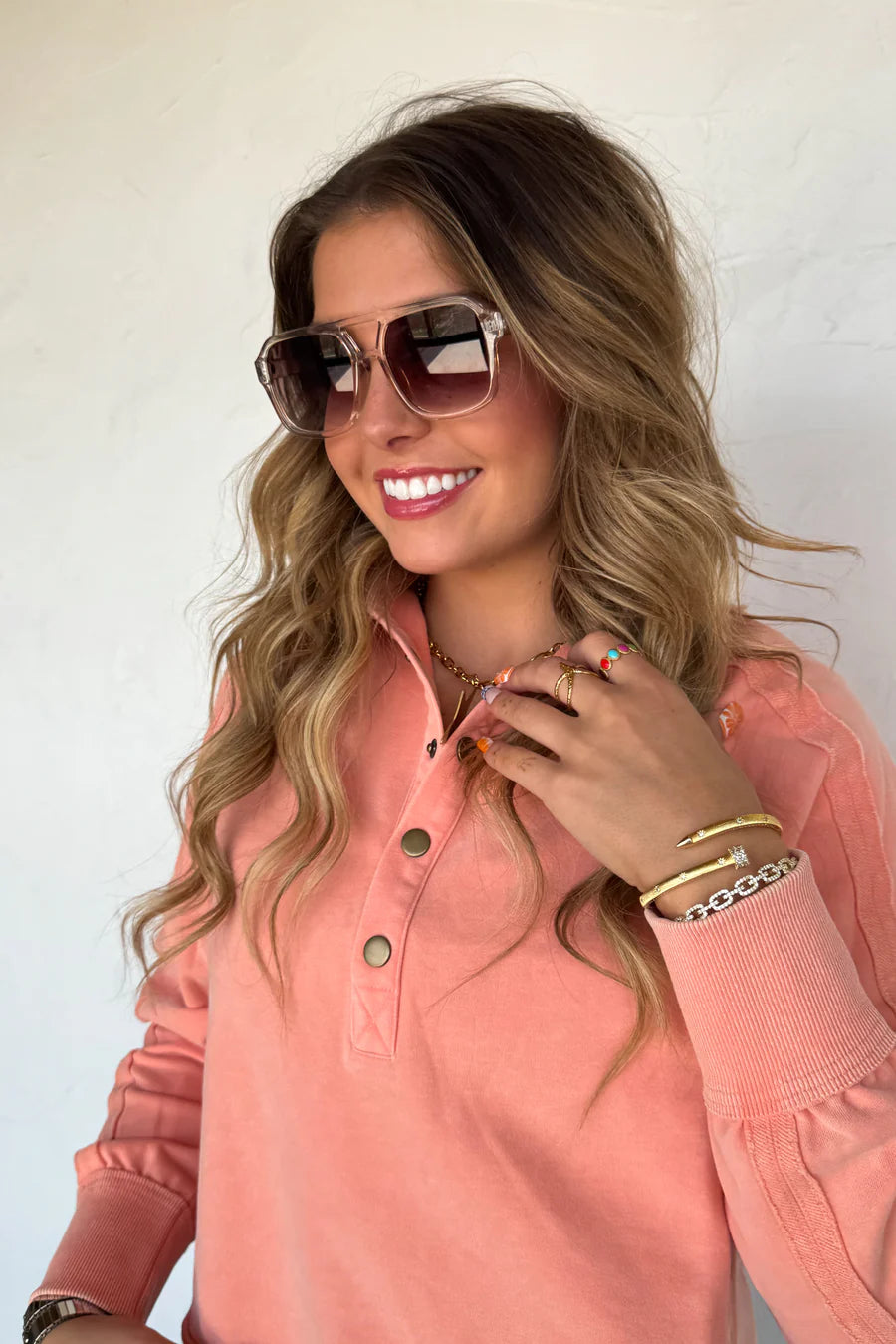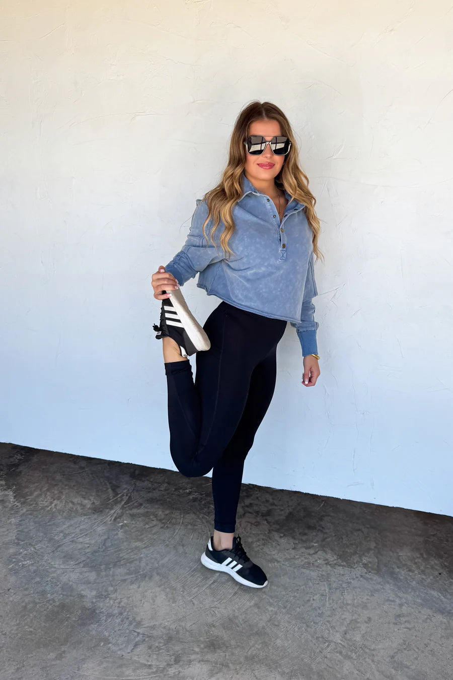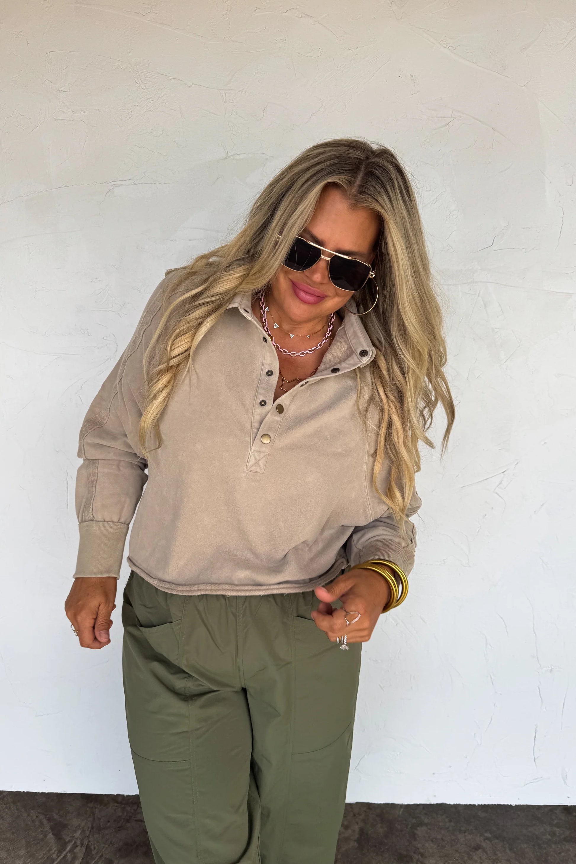 We spared no attention to detail in this raw hem/semi crop pullover! Such a relaxed, trendy look! Has a slouchy fit, vintage wash, exposed seaming and ribbed cuffs. Has super soft terry "sweatshirt" feel on the inside!