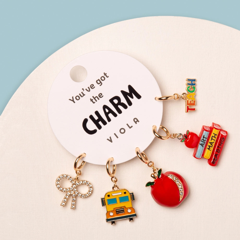 Get ready to show off your school spirit with our SCHOOL Charm Assorted Set! This quirky 5-piece set includes a rhinestone pavé bow, school bus, apple, books, and "teach" charm. Perfect for adding some personality to your caps, shoes, or necklaces. Get yours today and stand out from the crowd!
