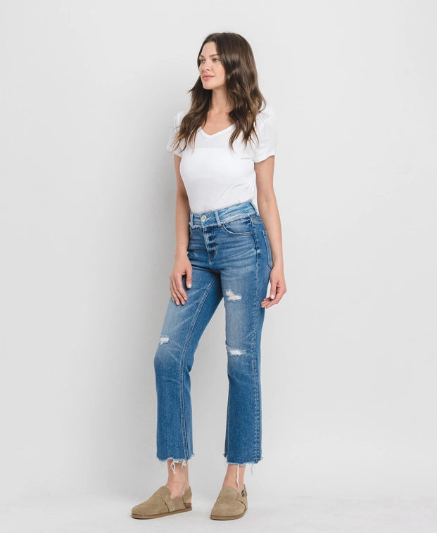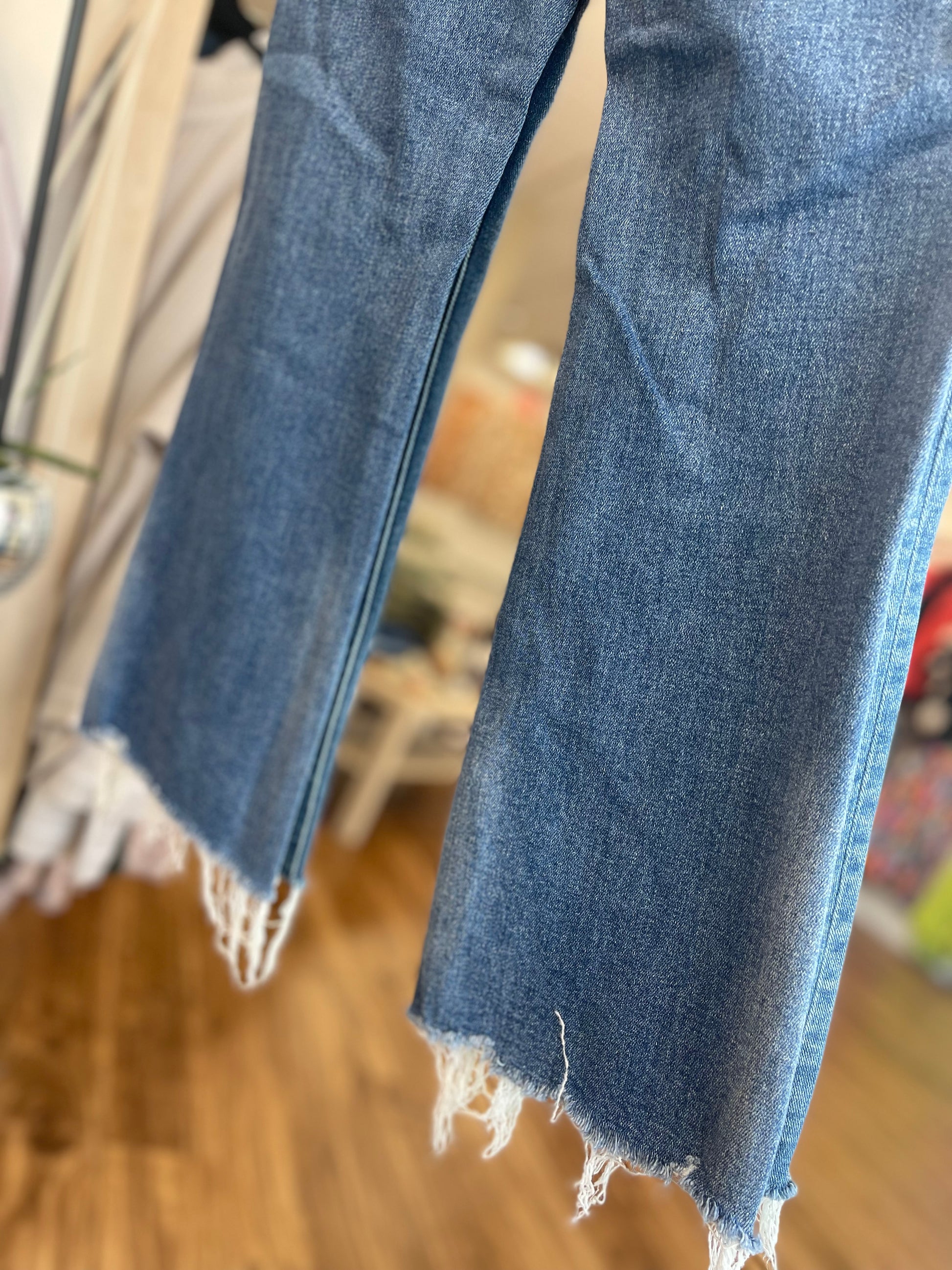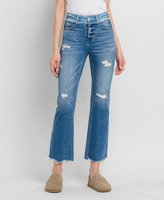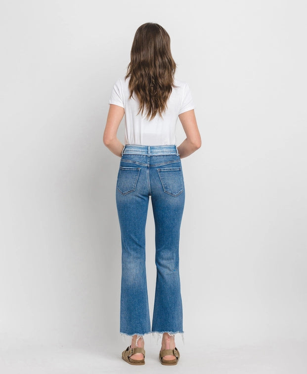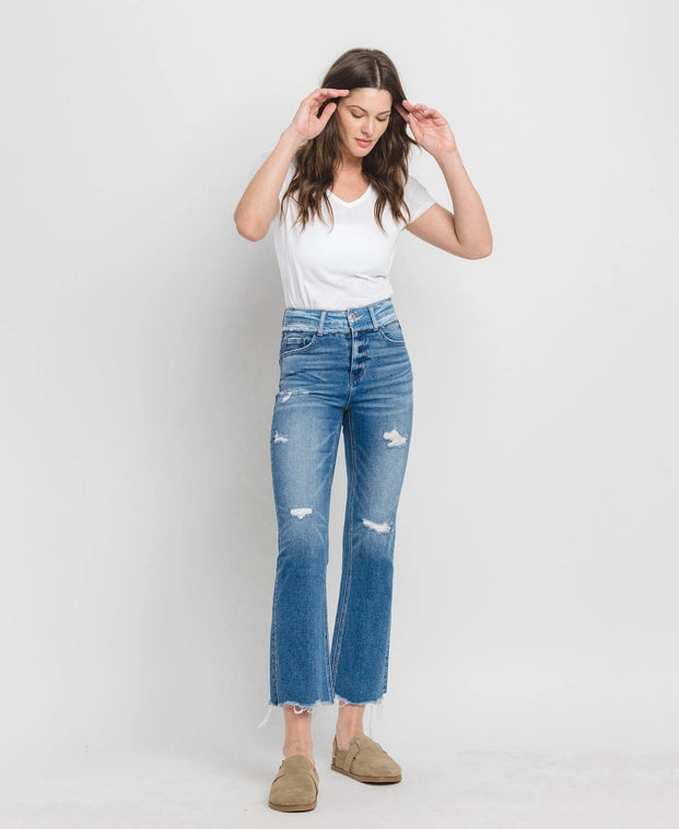 Elevate your denim game with our Staunch High Rise Kick Flare jeans. Made with comfortable stretch denim, these jeans feature a high rise waist for a flattering fit. The distressed detail and raw hem add a touch of edge, while the cropped length and kick flare style are perfect for showing off your favorite shoes.