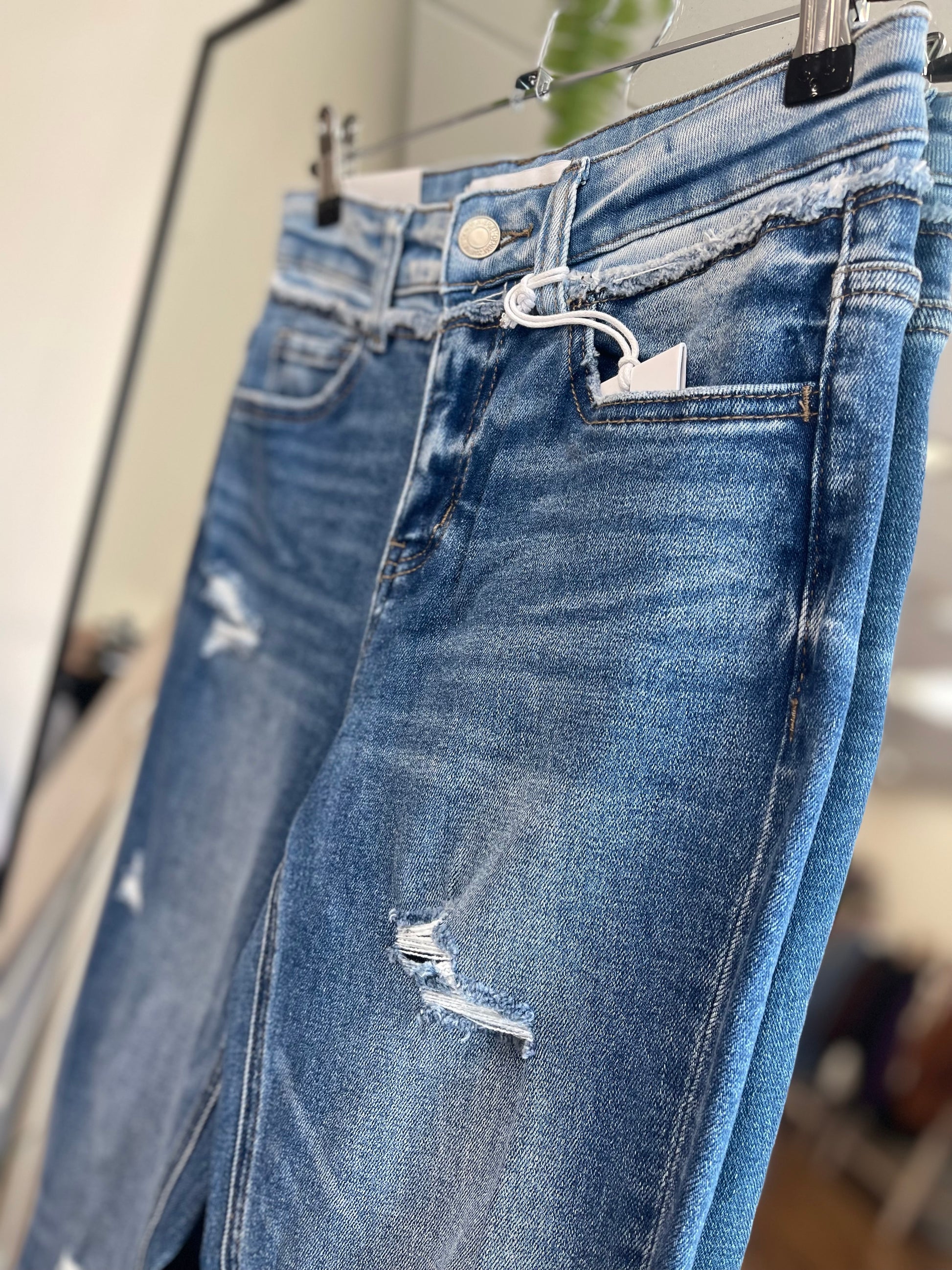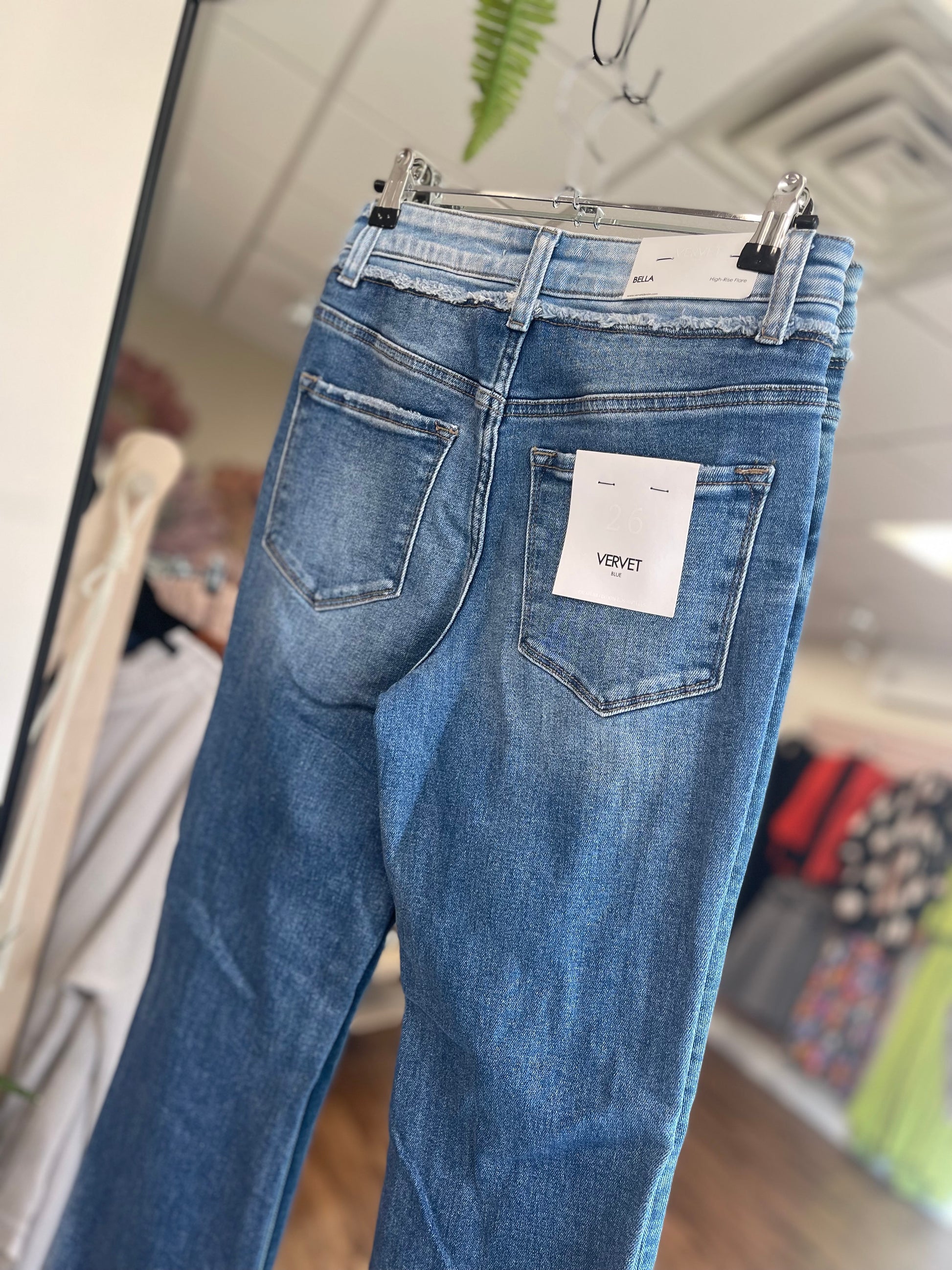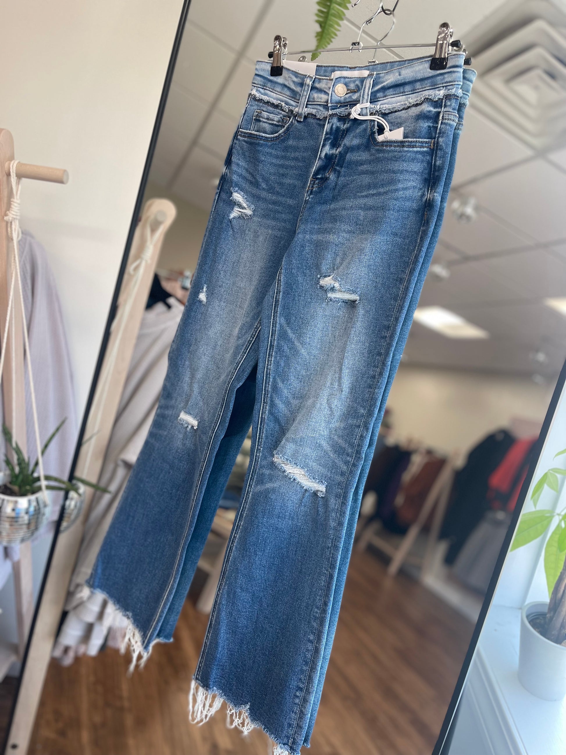 Elevate your denim game with our Staunch High Rise Kick Flare jeans. Made with comfortable stretch denim, these jeans feature a high rise waist for a flattering fit. The distressed detail and raw hem add a touch of edge, while the cropped length and kick flare style are perfect for showing off your favorite shoes.