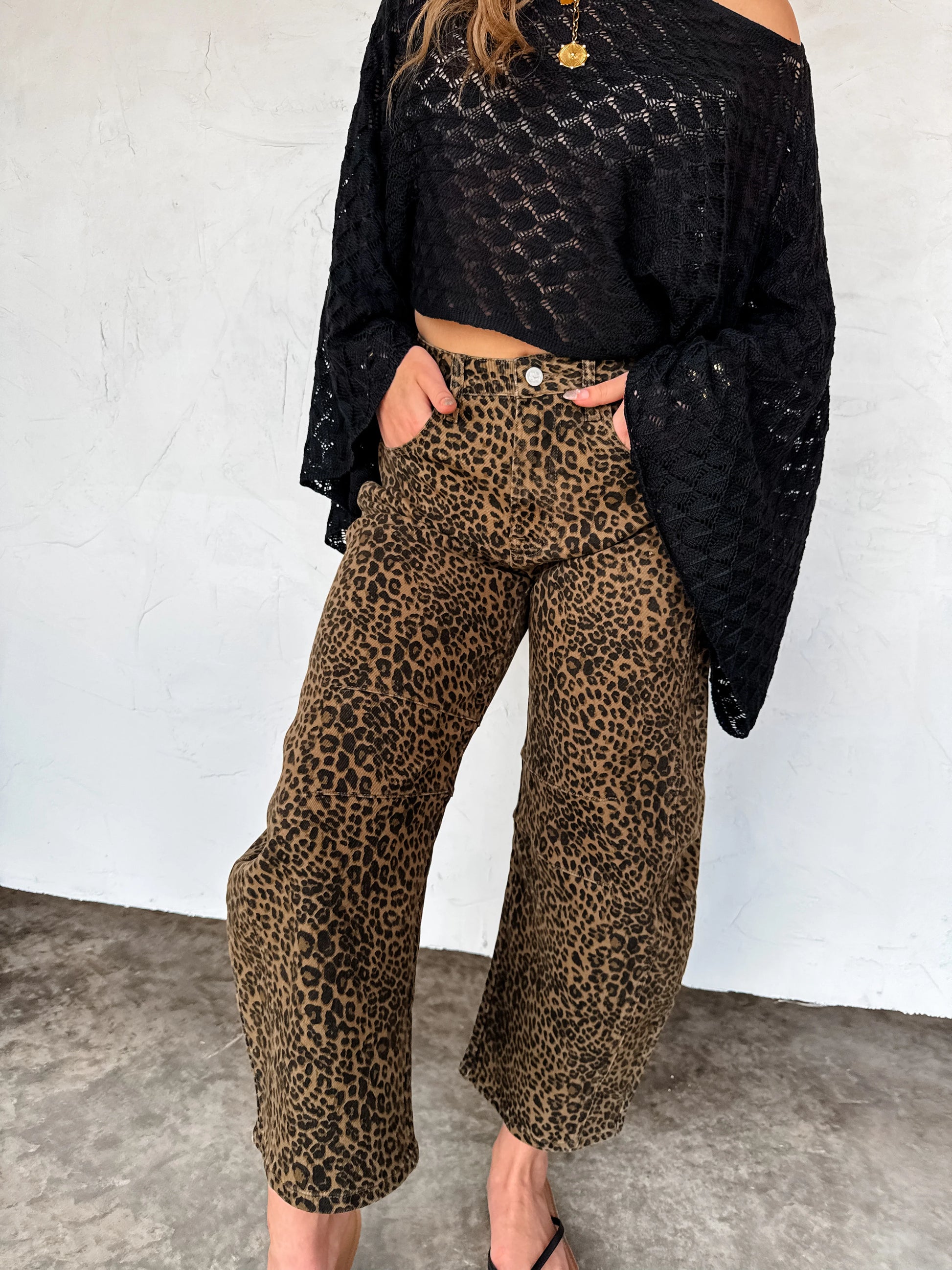 These trendy cheetah print barrel jeans are IT! The fit is so stretchy, mid rise waist and fits like a dream! Wide-legs that slightly taper at the ankle. Darted knees keep the "flare out" form like a true “barrel” Jean. Features beltloops, detailed seams on sides and a hem that can be rolled up or down. Fits TTS.
